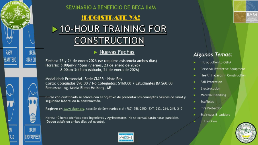 Horas: 10 horas técnicas para Ingenieros y Agrimensores. No se convalidarán horas parciales. (Debe asistir en ambos días del evento).